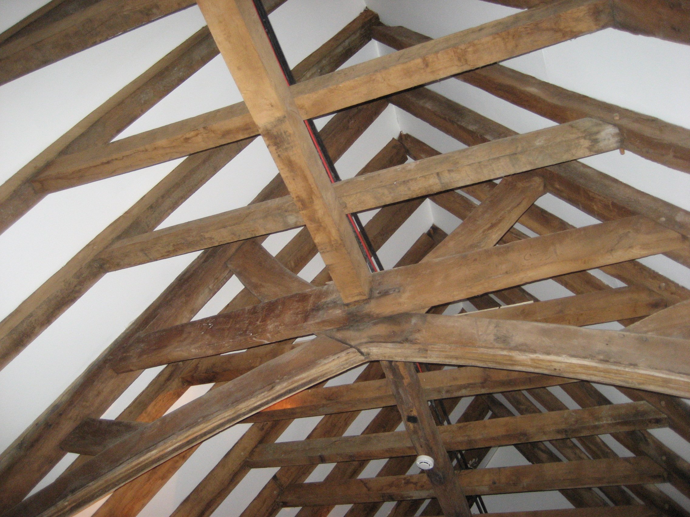 A comparable survival can be seen at the Grapes pub, dating to 1299, where another crown-post roof survives. Here, there may also be evidence of cob walls — construction using earth mixed with organic material — and battered walls, which slope slightly inwards as they rise, a technique that improves stability and sheds water.